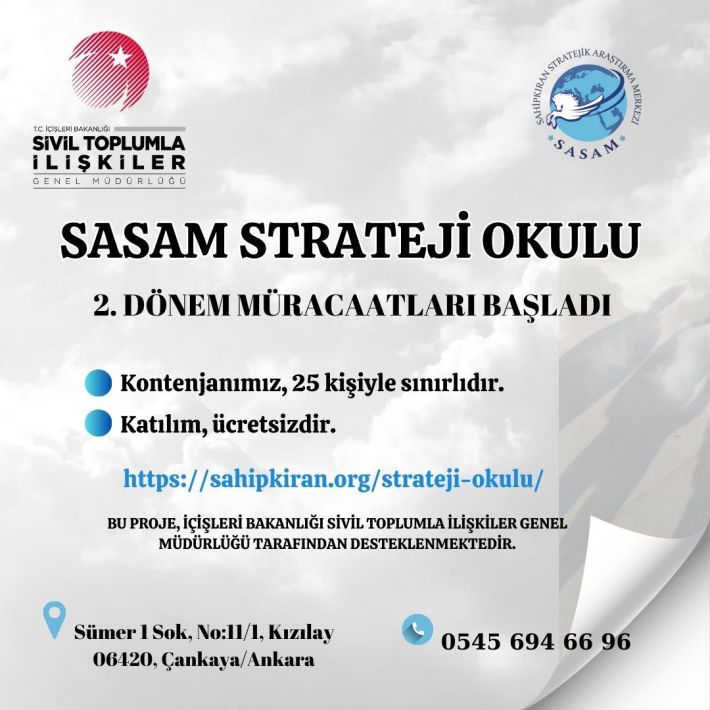 İçişleri Bakanlığı Sivil Toplumla İlişkiler Genel Müdürlüğü tarafından desteklenen ve katılımcılara uluslararası ilişkiler ve politika alanında stratejik düşünme ve karar verme yetkinliklerini geliştirirken, aynı zamanda pratik beceriler kazandırmayı hedefleyen SASAM Strateji Okulu 2. dönem müracaatları başladı.